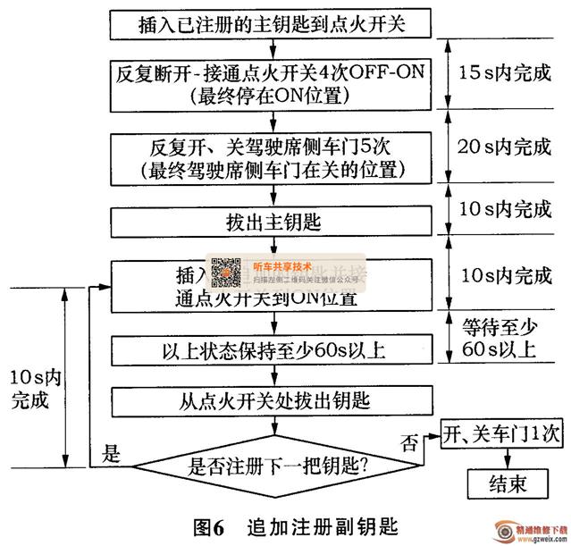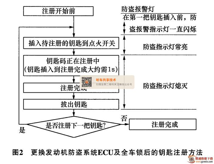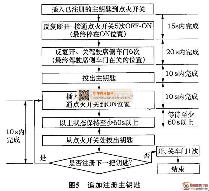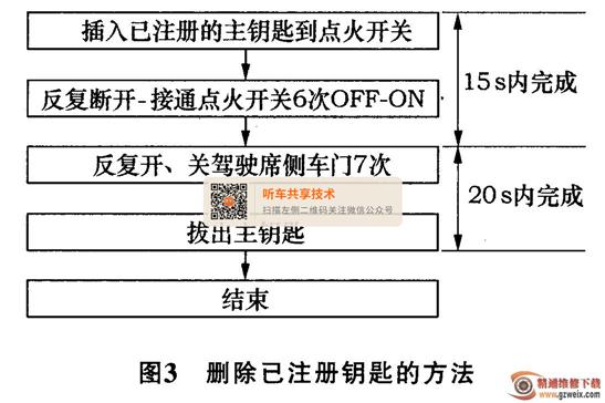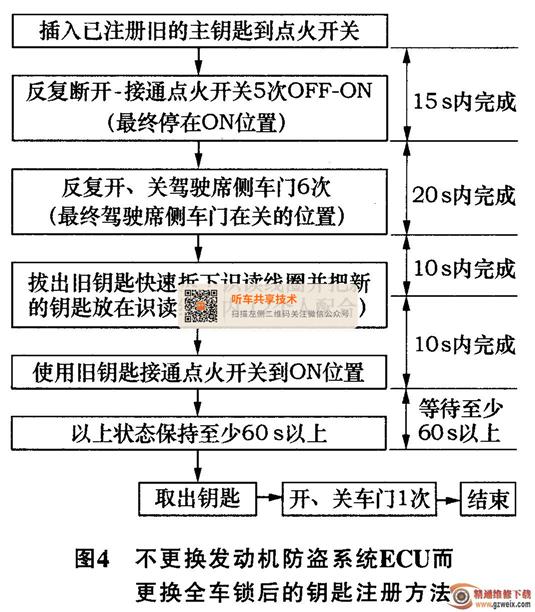 对于不更换发动机防盗系统ECU而更换全车锁后的车辆,其钥匙注册方法见图4。删除已注册的钥匙,只留一把主钥匙,追加注册新的全车锁主钥匙。更换新的点火锁,并确认新的钥匙匹配成功能起动发动机。如不能起动,请重复匹配,直至匹配成功。笔者利用此方法成功匹配数辆车,经过试验认证此方法可行。